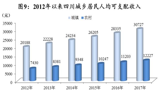 居民收入大幅提高。改革开放40年来,随着经济的快速增长与收入分配制度改革的深化,居民收入大幅提高。1978年,四川城镇居民人均可支配收入338元,农民人均纯收入127元。2017年,城镇居民人均可支配收入达30727元、农村居民人均可支配收入12227元,分别是1978年的90倍以上。特别是党的十八大以来,随着企业效益好转、精准扶贫力度加大、最低生活保障水平不断提升,城乡居民收入保持较快增长,2012-2017年城乡居民收入年均分别增长9.5%和11.1%,分别比GDP增速高0.4和2个百分点。与全国的差距逐渐缩小,2017年城乡居民人均可支配收入分别相当于全国平均水平的84.4%和91.0%,分别比2010年提高3.5和5.1个百分点。