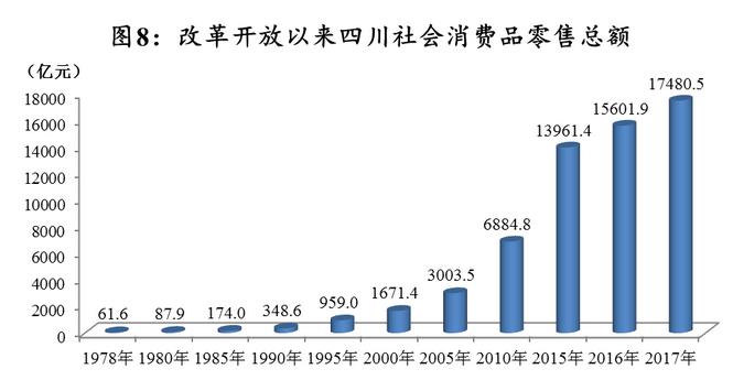 消费需求不断扩大。1978年,四川社会消费品零售总额仅61.6亿元,1996年超过千亿元,随着万村千乡市场工程、家电下乡、川货全国行、惠民购物全川行等系列活动的深入推进,消费潜力不断挖掘,2004-2013年社会消费品零售总额连续10年保持14%以上较快增长,2013年迈上万亿台阶,2017年达17480.5亿元,是1978年的283.8倍,年均增长15.6%。