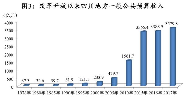 经济的快速发展带动四川财力水平的明显提升。1978年,四川地方一般公共预算收入不足40亿元,1989年超过百亿元,2008年超过千亿元,此后每3年上一个千亿元台阶,2017年达3579.8亿元,是1978年的95.9倍,年均增长12.4%。
