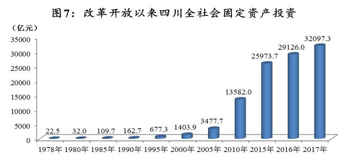 投资规模上台阶。改革开放以来,四川投资规模从百亿到千亿台阶用了13年时间,从千亿到万亿用了11年时间,从万亿到三万亿台阶仅用了8年时间,取得新突破的时间不断缩短。1978年,四川全社会固定资产投资仅22.5亿元,1985年投资规模上百亿元,1998年超千亿元。西部大开发和汶川特大地震灾后重建带动投资强势扩张,2009年投资规模迈上万亿元台阶,4年后的2013年超过两万亿,2017年全社会固定资产投资规模突破3万亿元,达32097.3亿元,比2008年翻两番,是1978年的1428倍,年均增长20.5%。