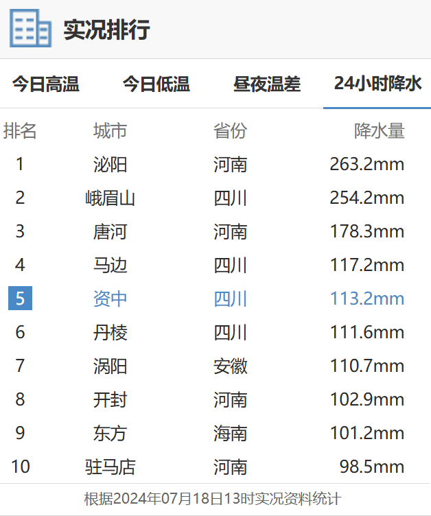 界面新闻注意到,截止7月18日13时,在过去24小时全国降水量前十名单中,河南和四川部分区域占了八位。河南省内的泌阳、唐河、开封、驻马店包揽四位,其中泌阳占全国降水量前十名单中的一位,为263.2mm。四川省内的峨眉山、马边、资中、丹棱也在全国降水量前十名单中,峨眉山以过去24小时累计降水量254.2mm高居排行名单二位。