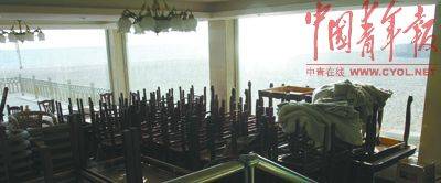游客稀少,大多数的疗养院和宾馆都已经关门停业。为数不多的一家还在营业的宾馆内,大堂的自动门也关闭了,人进出只能靠手推。房间里的设施也不全,连开水壶都是坏的。服务员说,冬天客人少,宾馆也就“一切从简”了。不过在宾馆的后院,工人正在加紧扩建和装修,说是为来年的夏季做准备。一处海鲜大排档大门关闭,盛海鲜水产的玻璃池里堆满了落叶。许多照相馆、彩扩店纷纷关门,为了方便偶尔的业务联系,玻璃门上贴了一张写着电话的纸条。