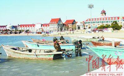 北戴河老虎石公园,夏天人们游玩嬉戏的海滩,冬天成了渔船临时的停泊点。
