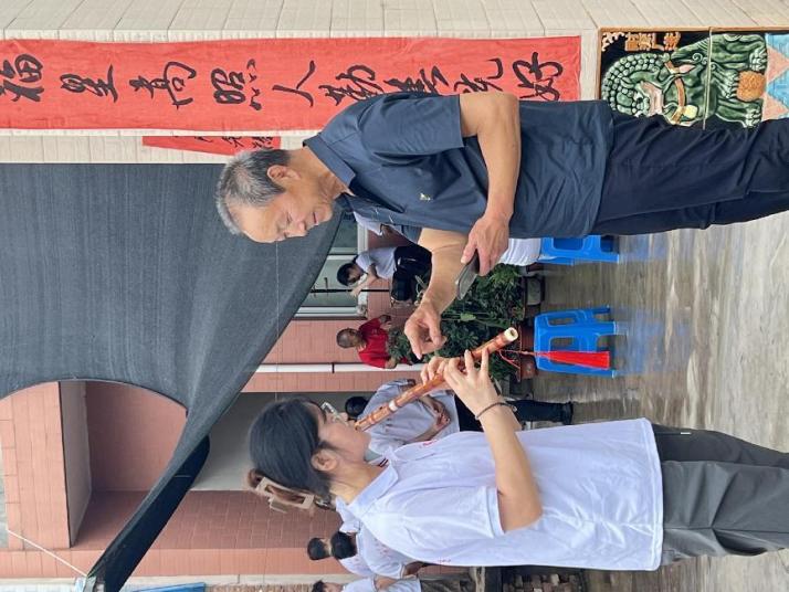 午饭后,各位传承人登台,手持三弦、二胡、笛子、板胡,还有独特的打击乐器:四页瓦和碰铃,为实践队师生进行了精彩的展演,展现了西府曲子的深厚文化和历史底蕴。活动即将结束时,师生们向传承人虚心请教西府曲子的演奏技巧,以及演唱时的咬字与发音。通过面对面的交流,不仅让队员们有机会感受传统艺术的魅力,还加强了对非物质文化传统西府曲子的敬仰,加深了对西府曲子传承的决心。