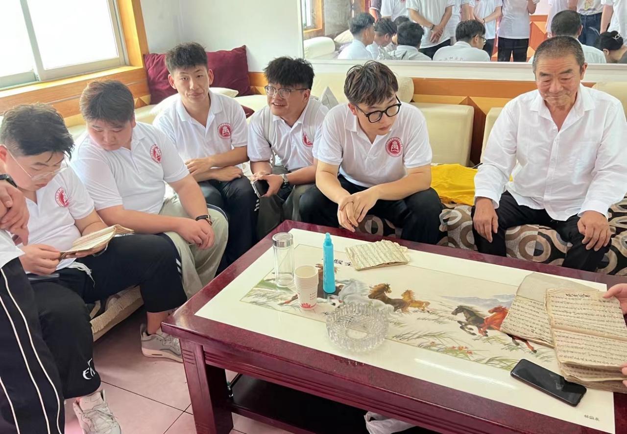 实践队深入宝鸡市凤翔区糜杆桥镇西白村,与西府曲子的第六代传承人张耀飞老师进行了深度交流与学习。张老师向大家展示了黄麻纸上用毛笔手抄的四本老词本,虽然纸张已经泛黄,但字迹依然清晰。这些老词本记录着西府曲子的经典唱段与历史变迁,也见证了几代曲艺人对这艺术的坚守与传承。张老师详细介绍了每一个老词本的来历与内容和及其在西府曲子传承中的重要性。通过张老师的讲解,队员们了解了西府曲子在传承中面临的种种困难和挑战,以及传承人为保护这一非遗文化做出的不懈努力。实践队的师生们聚精会神地翻阅着这些宝贵的历史资料,仿佛通过这些曲谱与文字,听到那古老而悠扬的曲调。
