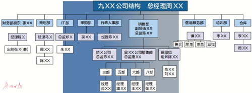 该集团分工明确,老板为九××公司总经理周某,骨干成员有副总经理杨某,总监陈某、唐某等,下设财务部、策划部、IT部、采购部、行政人事部、销售部、售后服务部、培训部、仓库等九个部门。