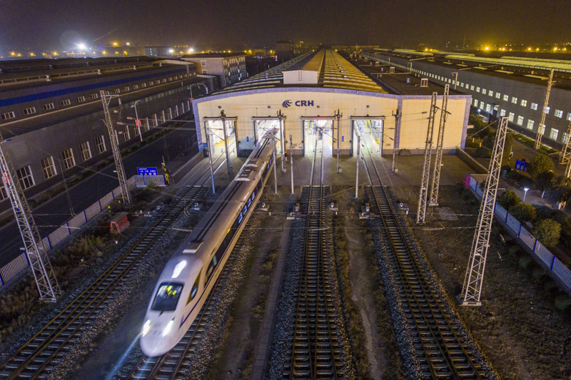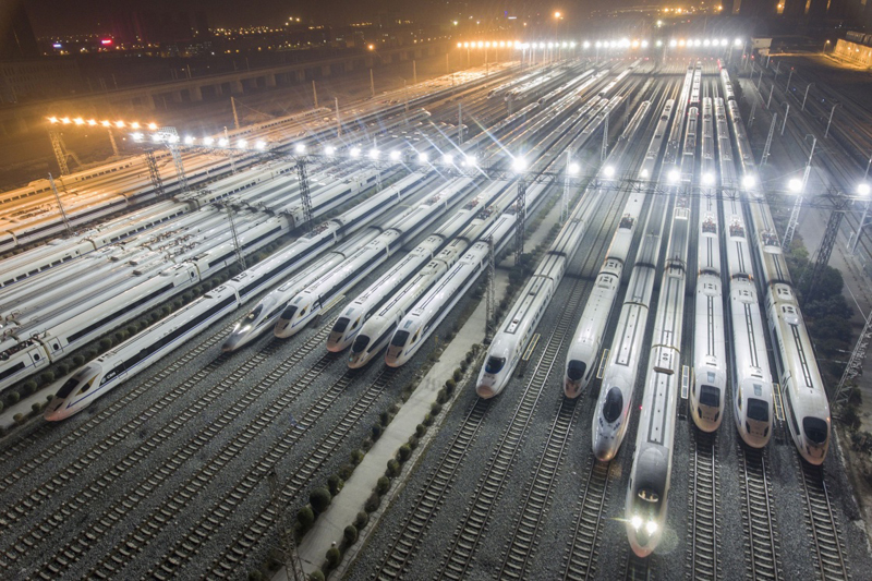 12月5日夜,动车组列车停放在西安动车段存车场。