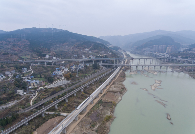 12月6日,D4254次列车通过位于广元市北郊的西成高铁嘉陵江特大桥。列车行驶在嘉陵江西岸,东岸是始于北魏、兴于唐和五代的千佛崖摩崖石刻。