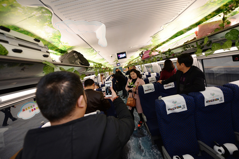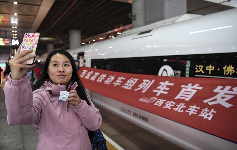 12月6日,乘客在西成高铁西安首发的D4251次列车上拍照留念。