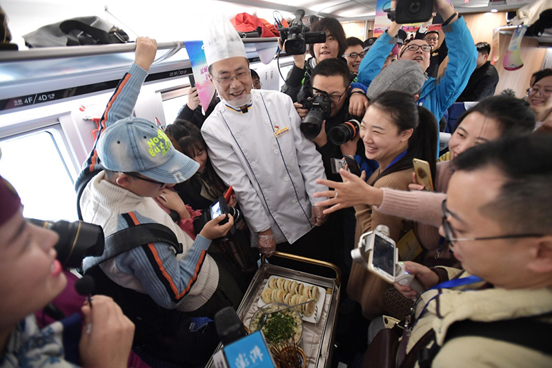 12月6日,工作人员在成都东开往西安北的D4252次列车上进行美食品鉴活动。
