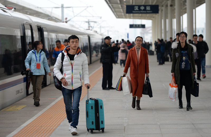 12月6日,旅客乘坐西成高铁西安首发的D4251次列车抵达汉中站。