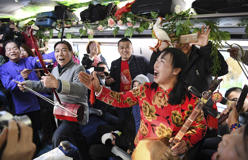 12月6日,华阴老腔演员在西安北站首发的熊猫号动车车厢里为旅客表演。