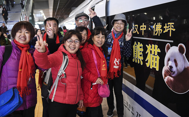 12月6日,旅客在西安北站首发的熊猫号动车前留影。