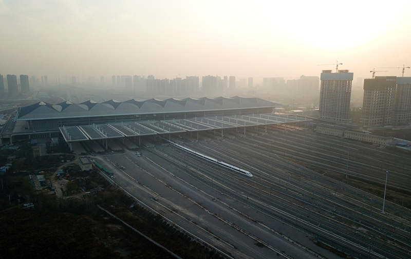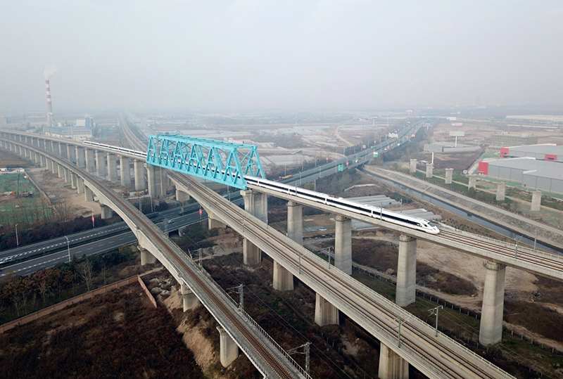 12月6日,西安北开往成都东的动车组列车行驶在西成高铁跨西宝高铁特大桥上。