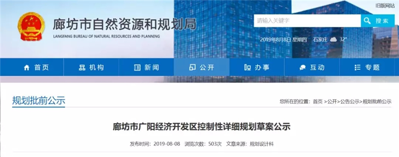 最新消息!廊坊市自然资源和规划局公示了廊坊市广阳经济开发区控制性详细规划草案,总用地面积约1818.19公顷,可容纳人口约10万人。公示时间为2019年8月8日至9月6日。详情↓↓