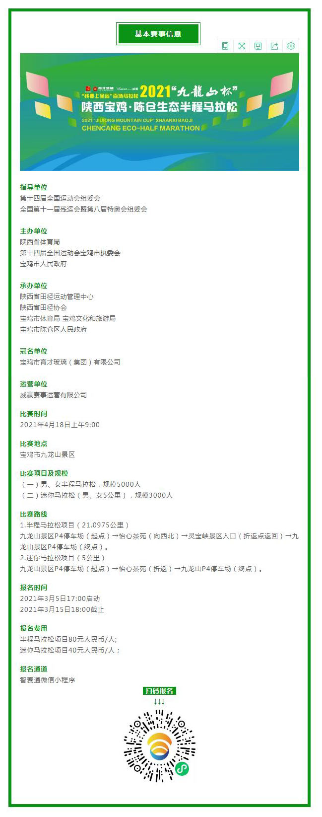 2021年4月18日上午,“九龙山杯”陕西宝鸡·陈仓生态半程马拉松将在宝鸡九龙山盛大开跑。3月5日17:00 报名正式启动!