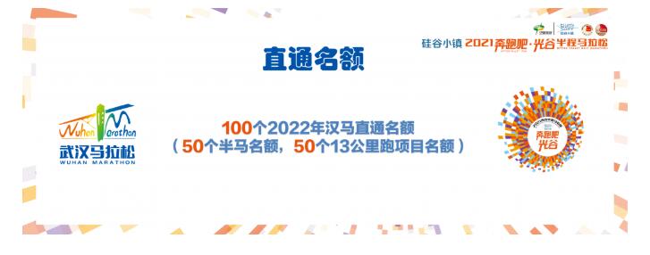 作为武汉马拉松系列赛事,硅谷小镇2021奔跑吧·光谷半程马拉松组委会将提供100个名额(其中包括50个半程马拉松名额,50个13公里跑名额)直通2022年武汉马拉松的名额作为福利。