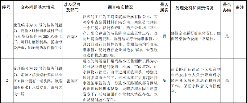 截至2024年8月6日12时,省第一生态环境保护督察组交办涉及宝鸡市生态环境信访件67件,现将第八批交办问题办理结果通报如下: