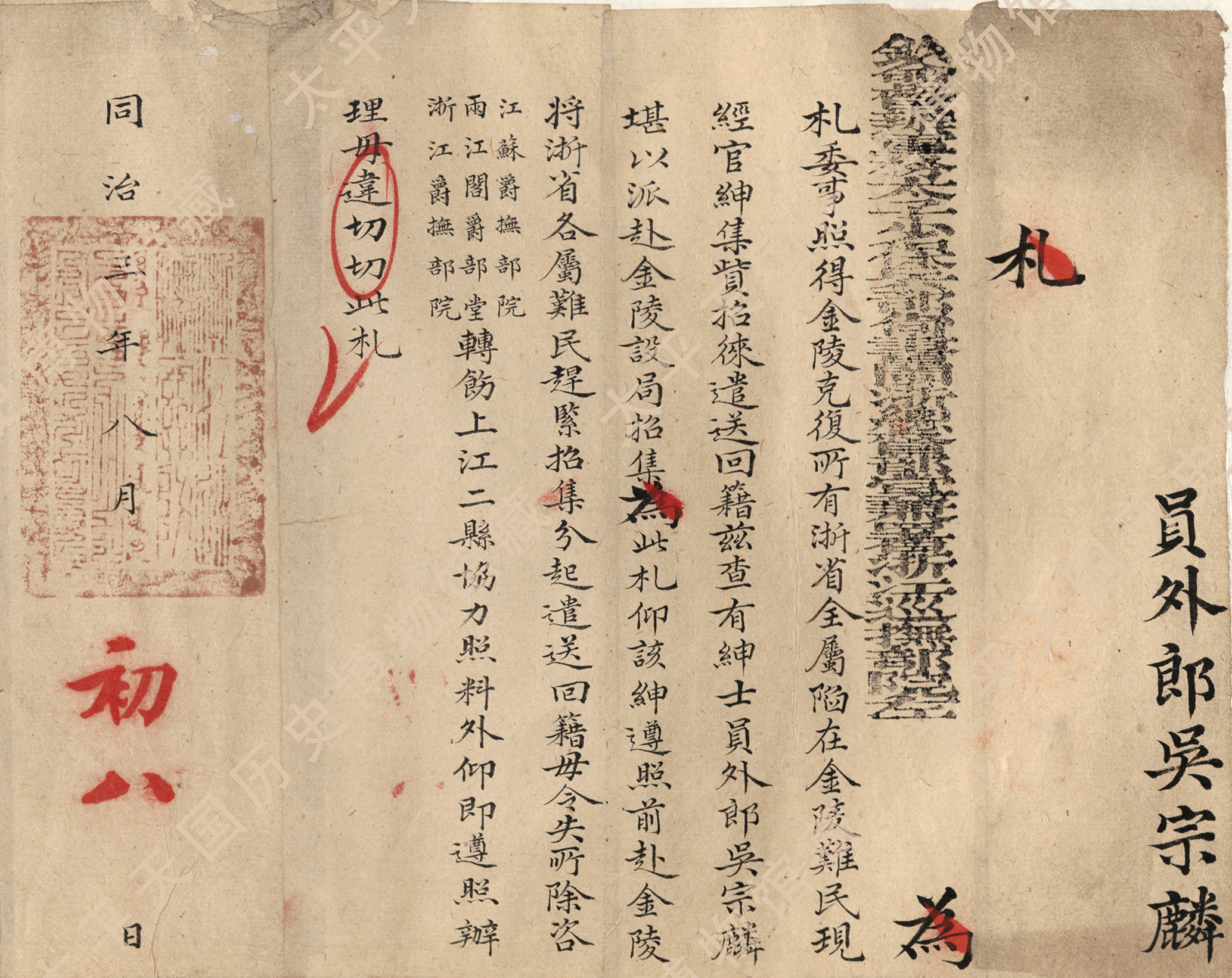 钦命督办军务太子少保兵部尚书闽浙总督部堂兼署浙江巡抚部院左为札委事:照得金陵克复,所有浙省全属陷在金陵难民,现经官绅集资招徕,遣送回籍。兹查有绅士员外郎吴宗麟堪以派赴金陵设局招集,为此札仰该绅遵照前赴金陵,将浙省各属难民赶紧招集,分起遣送回籍,毋令失所。除咨江苏爵抚部院、两江阁爵部堂、浙江爵抚部院转饬上江二县协力照料外,仰即遵照办理毋违。切切。此札。