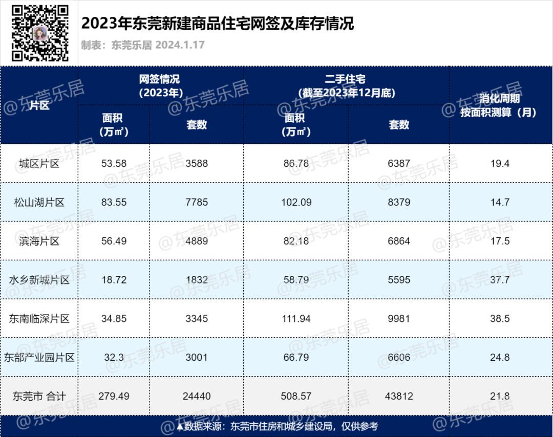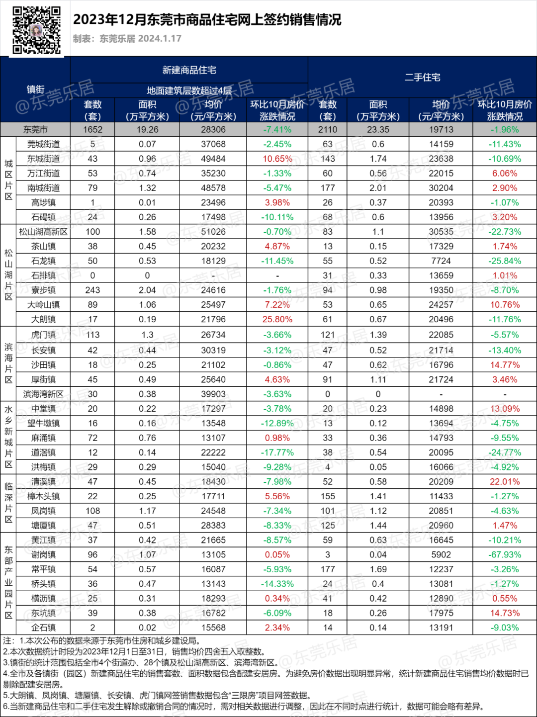 日前,东莞市住房和城乡建设局官网发布了《2023年12月东莞市商品住宅网上签约销售情况》和《2023年12月底东莞市分镇街新建商品住宅库存情况》。至此,2023年东莞楼市成绩单已全数出炉。