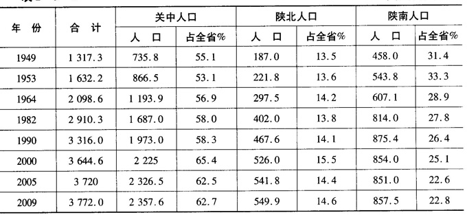 陕西省按照自然地理特征,大致分为关中平原、陕南秦巴山地和陕北黄土高原三大自然区域。由于自然条件差异,人口分布很不均匀。关中一直是人口稠密区,1949年建国初,关中地区总人口735.8万,占全省总人口55.8%,人口密度为137.5人/平方公里;陕南458.6万人,占34.8%,人口密度为65.5人/平方公里;陕北地区187万人,占14.2%,人口密度为22.7人/平方公里。占全省总面积26%的关中平原,承载着55.8%的人口,人口密度分别是陕南和陕北的2.1倍和6.1倍。
