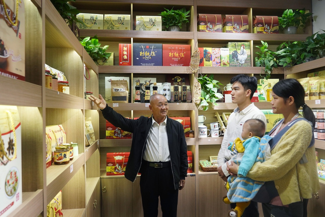 2020年10月21日,江西省赣州市于都县梓山镇潭头村村民孙观发(左一)向游客介绍当地的特色农产品。新华社记者 万象 摄
