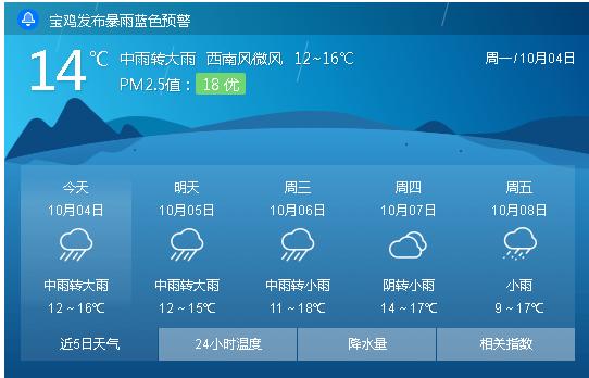 截至10月4日6时,全市小到中雨,陇县、千阳、麟游、陈仓西山出现暴雨,其中陇县、陈仓西山局地大暴雨。