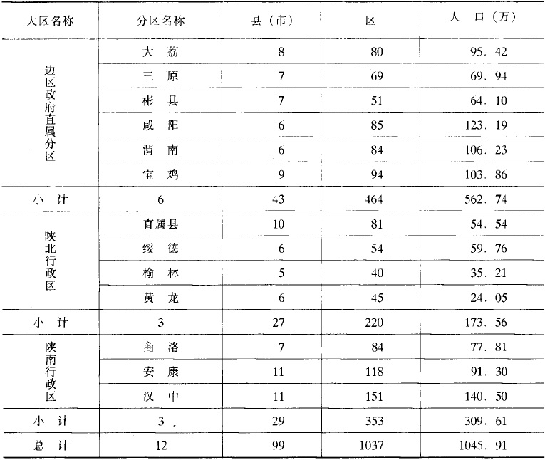 10月,陕南行政区划归边区政府管辖,陕南行政区下辖商洛、安康、汉中3个分区30个县市。截止1949年底,边区在陕西境内设县级行政单位99个,区级单位1037个,人口1045.91万。(见表1·7)