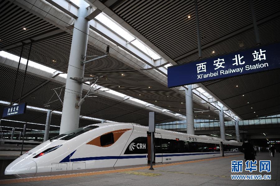 2017年11月22日,西成高铁进入全线拉通试验阶段。图为55251次动车组试验车准备从西安北站驶出。新华社发(张博文摄)