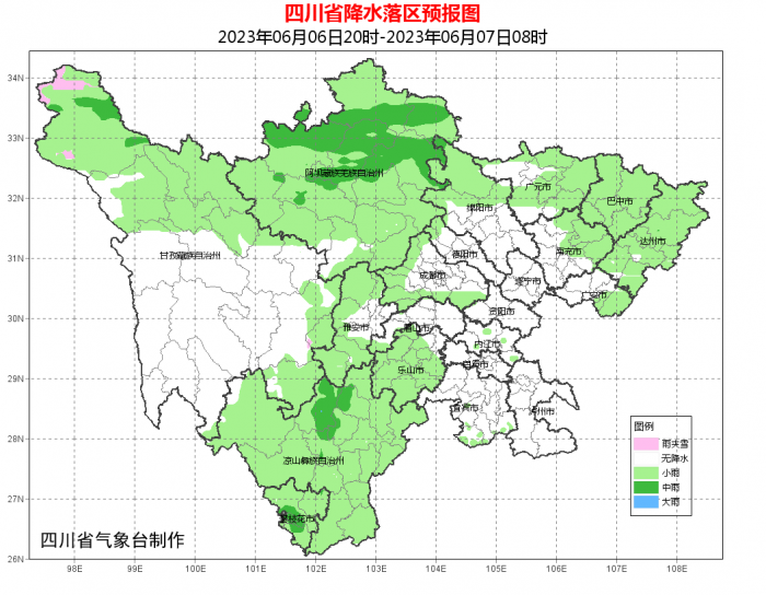 今天晚上:广元、巴中、达州、雅安、乐山5市和南充、广安2市东部及绵阳西部阴天间多云有分散阵雨或雷雨,盆地其余地方多云;甘孜州西南部多云间晴,川西高原其余地方和攀西地区阴天间多云有阵雨或雷雨,其中阿坝州北部和凉山州北部的局部地方有中雨。
