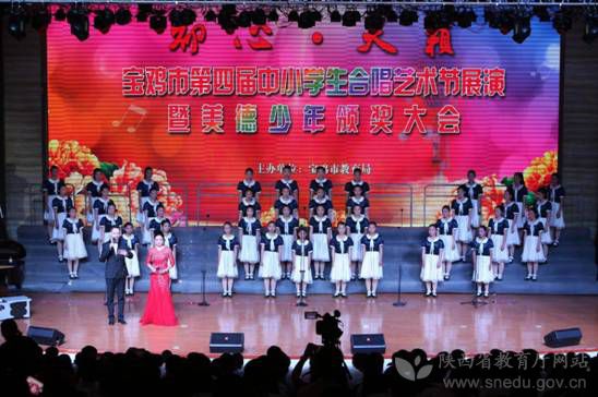 【宝鸡市】5月29日,宝鸡市教育局在宝鸡市教育中心举行第四届中小学生合唱艺术节展演暨“美德少年”颁奖大会,喜迎六一儿童节。经二路小学的一曲《一路》的歌声拉开帷幕。随后,千阳县红山中学、宝鸡幼儿园、宝鸡市特殊教育学校等获奖学校相继登台表演节目。合唱是感染力最强、最容易普及、也最受中小学生欢迎的艺术形式之一,在美育、德育和艺术教育中占据着非常重要的位置,对于激活艺术细胞、陶冶艺术情操、培养合作意识、涵养道德品质具有潜移默化的作用。经过几年发展,全市中小学基本实现“校校有合唱队,班班有歌唱声”,极大激发了师生的艺术热情,成为素质教育的重要平台和艺术教育的响亮品牌。本届合唱艺术节以“初心·天籁”为主题,就是要砥砺我们不忘初心,立德树人,聚焦核心素养,回归教育本真,让广大师生在艺术氛围中实现全面发展。据了解,宝鸡市第四届中小学生合唱艺术节从2018年3月份拉开帷幕,通过学校、县区、市级比赛,营造了和谐向上、健康文明的校园文化氛围和艺术教育环境。最终,宝鸡第一中学、宝鸡中学、千阳县红山中学获得中学组一等奖,渭滨区经二路小学、千阳县启文小学、眉县首善东关小学获得小学组一等奖。活动现场还表彰了20名“美德少年”, 他们身上闪耀着自强自立、诚实守信、孝老爱亲、勤劳节俭、文明有礼、助人为乐的宝贵品质,值得全市中小学生学习。宝鸡市副市长武军出席会议并讲话。他指出,开展合唱艺术教育,为孩子们搭建了展现艺术天赋、促进全面发展的舞台,这是教育系统立德树人的重要举措,也是提升宝鸡教育内涵品质和育人水平的重要抓手。大会还将表彰了宝鸡市“美德少年”,他们以自己的凡人善举,成为孩子们学习的榜样。希望全市少年儿童从小热爱党、热爱祖国、热爱人民,争当品德好、身体好、学习好的小标兵,养成爱劳动、爱探索、爱创造的好习惯,做德智体美全面发展的社会主义建设者和接班人。他希望全社会关心少年儿童的成长,努力为孩子们创造安全、和谐、优美、宽松的学习生活环境,为他们的健康成长和幸福未来负责。特别是教育部门要进一步扩大优质教育资源的供给,引进先进教育理念,提升教育保育质量,让孩子们拥有一个幸福而充实的童年。要更多关爱特殊少年儿童,提供更完善、更全面、更细致的教育服务,真正做到“一个也不能少”,使这些孩子也拥有一个幸福而阳光的童年。