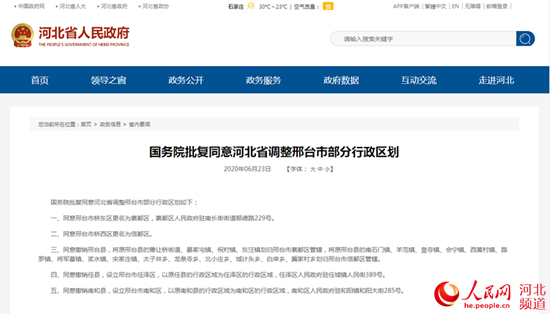 人民網石家庄6月23日電 6月23日,據河北省政府網站消息,國務院批復同意河北省調整邢台市部分行政區劃如下: