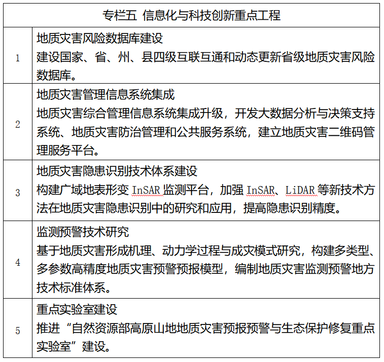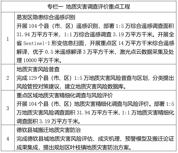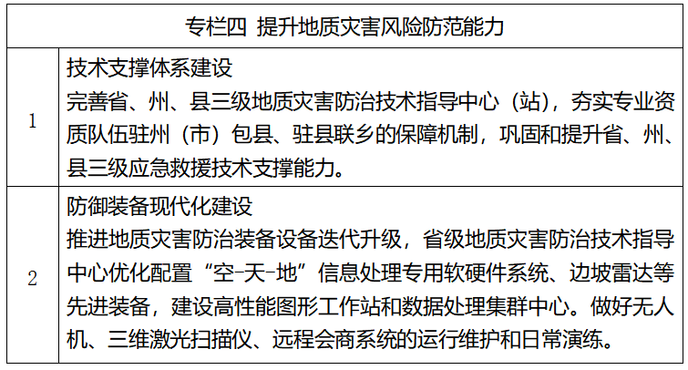 ——地质灾害防治科技支撑明显加强。进一步完善地质灾害风险管理服务平台,提升信息化服务能力,完善省级地质灾害防治技术指导中心、隐患识别中心建设,规范和完善地质灾害防治技术标准和管理体系。推进自然资源部重点实验室及科技创新平台建设,建强地质灾害防治科研人才队伍,促进地质灾害防治关键技术科研攻关和成果转化。