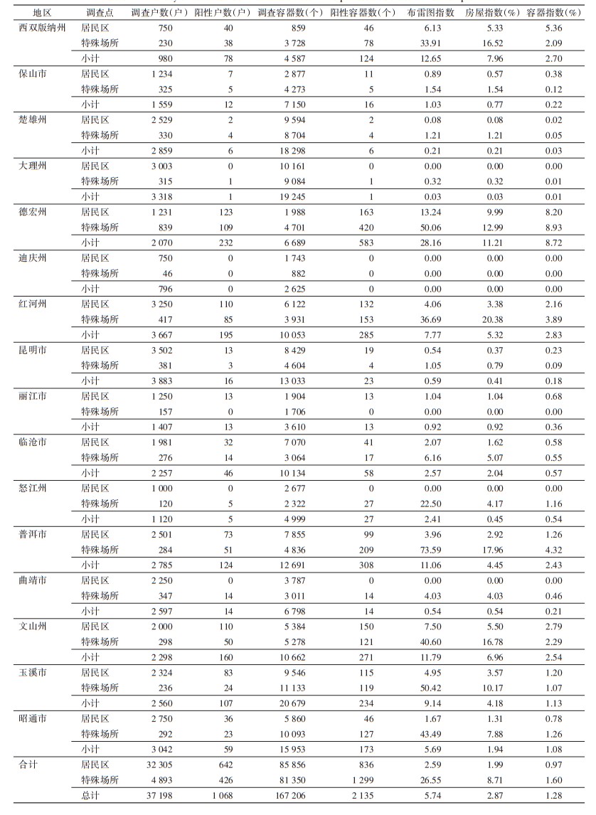 容器阳性率排前5位的是德宏州8.72%(583/6 689)、红河哈尼族彝族自治州(红河州)2.83%(285/10 053)、西双版纳州2.70%(124/4 587)、文山壮族苗族自治州(文山州)2.54%(271/10 662)和普洱市2.43%(308/12 691)。见。