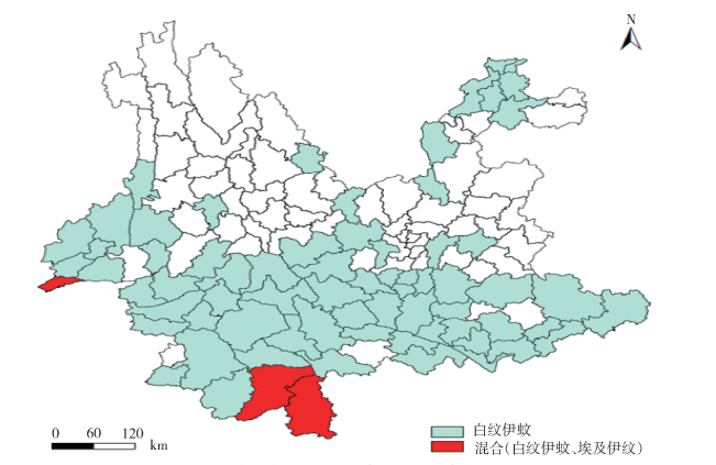 白纹伊蚊在云南省分布广泛,是多数县(市、区)主城区的主要伊蚊蚊种。本研究首次全面开展县(市、区)主城区的伊蚊调查。结果提示全省16个州(市)中,15个州(市)的71个县(市、区)主城区存在白纹伊蚊分布,其中3个既有埃及伊蚊又有白纹伊蚊分布,主要分布在海拔1 000 m以下,21°8′32″~26°0′0″ N,97°31′39″~106°11′47″E之间,东至云南省的富宁县,南至勐腊县,西至盈江县,北至绥江县。迪庆藏族自治州未发现伊蚊孳生,平均海拔为3 380 m,属于温带和寒带季风气候。全省58个县(市、区)未发现伊蚊孳生,其原因可能是这些县(市、区)的主城区海拔大部分在2 000 m以上,且调查仅在主城区开展,口岸和乡镇未全部覆盖,存在一定的局限性。