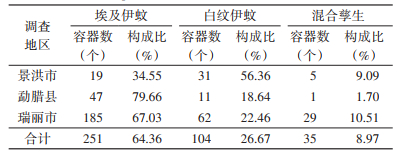 调查显示景洪市、勐腊县和瑞丽市存在白纹伊蚊和埃及伊蚊幼虫混合孳生,2种伊蚊的种间竞争力强弱、是否存在种间杂交,还需进一步研究。