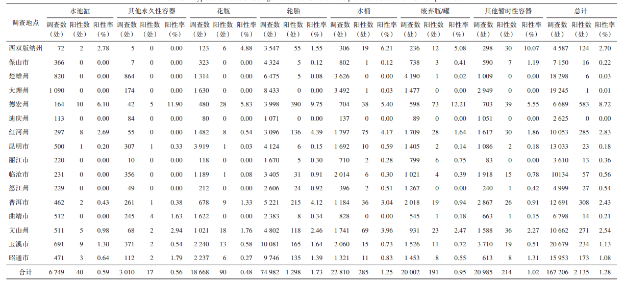表 2 云南省不同调查场所积水容器类型及伊蚊孳生情况 Table 2 Water container types and Aedes breeding in different investigation sites in Yunnan province