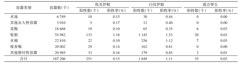 调查共发现伊蚊孳生的阳性容器2 135个,采集伊蚊幼蚊样本带回实验室经形态学鉴定,结果有白纹伊蚊孳生1 849个,占86.60%,埃及伊蚊孳生251个,占11.76%,白纹伊蚊和埃及伊蚊混合孳生的35个,占1.64%。白纹伊蚊、埃及伊蚊和混合孳生的孳生率分别是1.11%(1 849/167 206)、0.15%(251/167 206)和0.02%(35/167 206)。见。