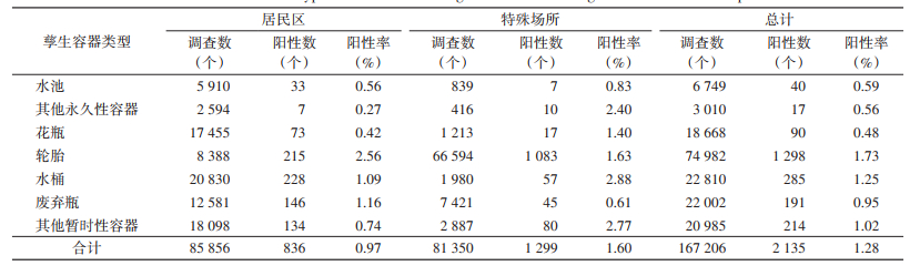 2.3 不同积水容器及伊蚊孳生情况调查发现7类积水容器,共计167 206个,其中居民区调查85 856个,特殊场所81 350个。积水容器类型以轮胎最多,共发现74 982个,占44.84%,其次为水桶22 810个,占13.64%,废弃瓶22 002个,占13.15%。