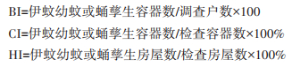 1.2 调查方法采用布雷图指数(BI)法,调查居民区(家中及周围5 m范围环境)或者特殊场所的所有积水容器,有媒介伊蚊幼蚊或蛹孳生计为阳性,采集阳性容器内的幼蚊,显微镜下鉴定蚊种[]、计数并登记,计算BI、房屋指数(HI)和容器指数(CI)等,计算公式如下: