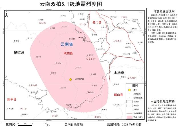 【最新】楚雄双柏5.1级地震烈度分布图公布!此次地震最高烈度6度