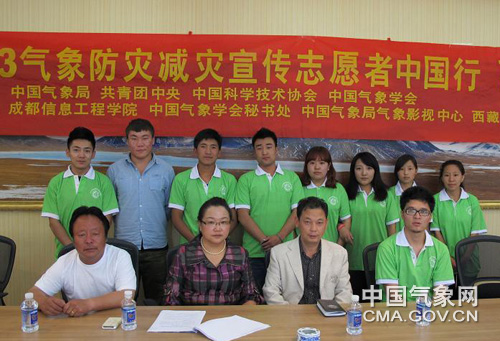 中国气象报记者次吉报道 7月22日,2013年气象防灾减灾志愿者中国行西藏队活动启动仪式在拉萨举行。西藏自治区气象局预报处、气象学会的主要负责人与来自成都信息工程学院的志愿者参加了启动仪式。