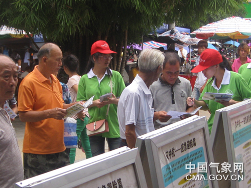 中国气象报通讯员周启强报道  7月18日,由防城港市气象局组织,上思县人民政府、县气象局协办的2013年气象防灾减灾宣传志愿者中国行广西分队首场科普活动在上思县街心公园隆重举行,志愿者采用摆设展板、发放资料、问卷调查、有奖问答等方式开展气象科普宣传,受到当地群众的热烈欢迎。