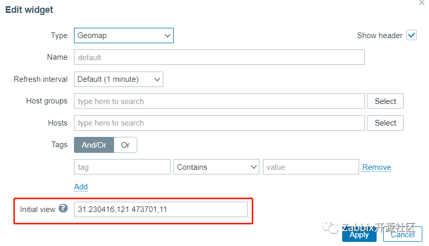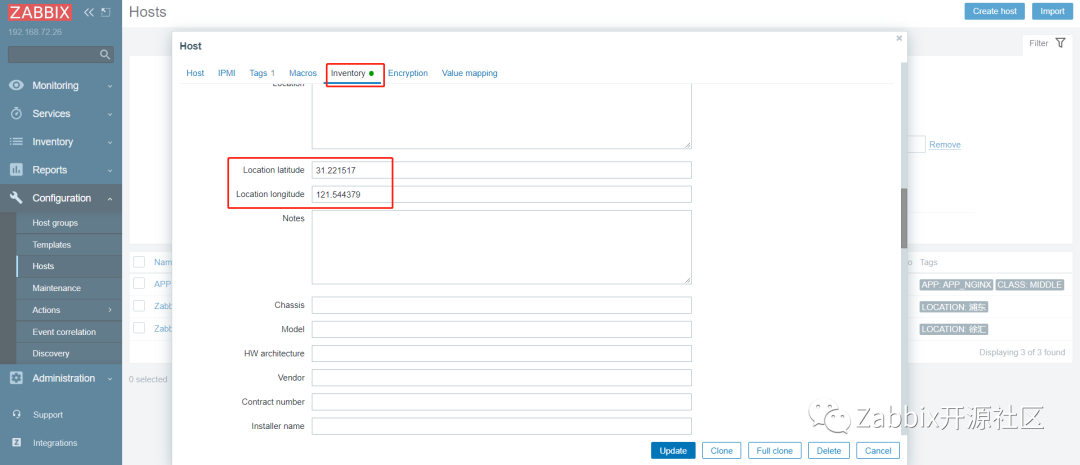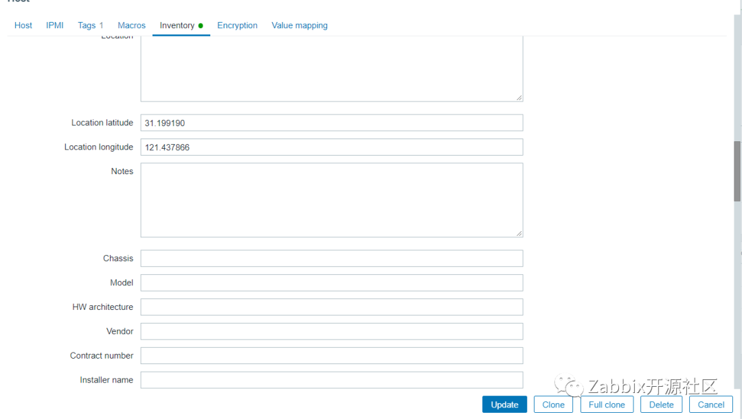 想要将告警机器地理位置标记在地图上,那么这个主机必须要有地理位置记录,而Geomap的使用就是和Zabbix里面的主机资产的经纬度关联使用。