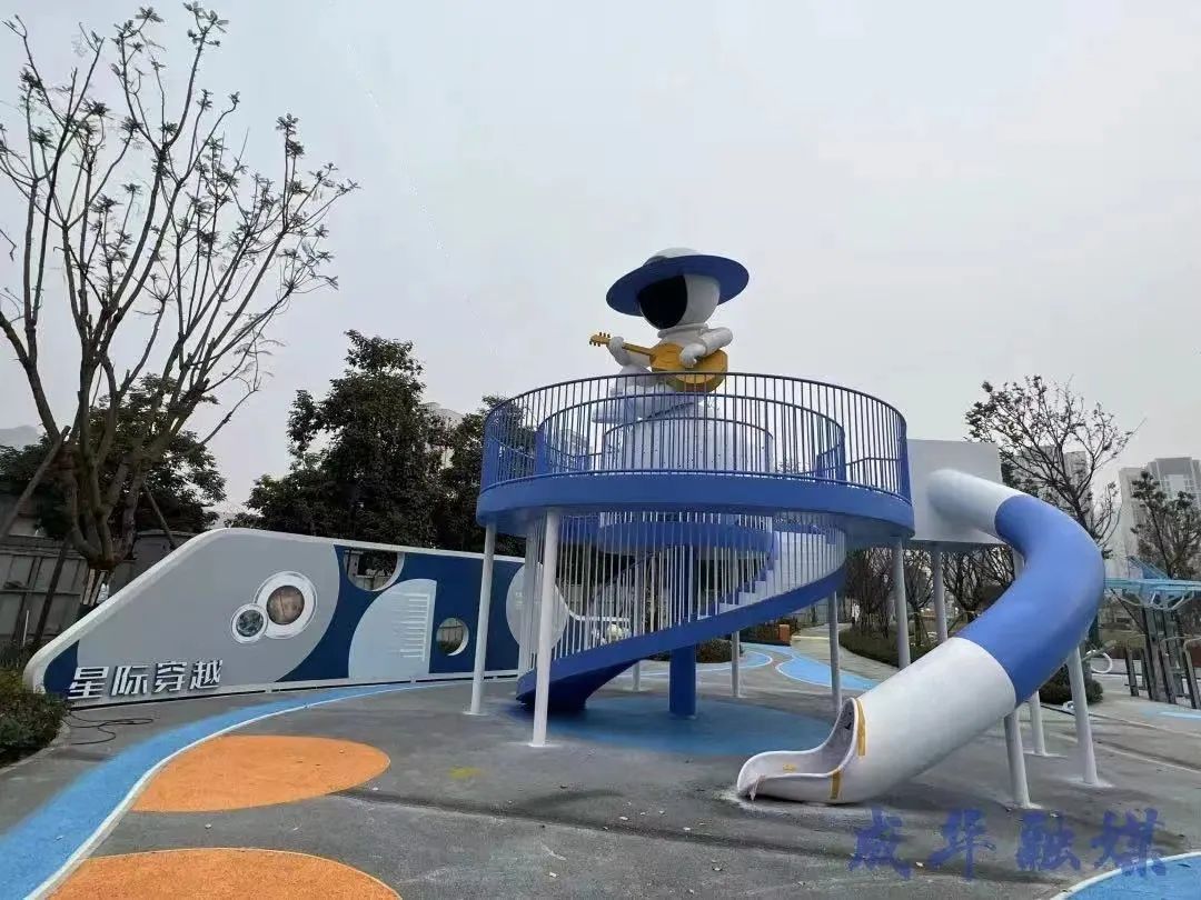 以“太空船—银河乐园—空间站”为线索,小游园里充满了各种太空元素。入口展示空间打造成“城市之窗”主题空间,下沉空间的地形设计错落有致。小游园“银河乐园”主体空间充满了银河船舱、银河航道、陨石流星、虫洞等太空元素,由步道串联,让人仿佛漫游宇宙。
