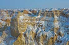 海上魔鬼城景区位于新疆阿勒泰地区福海县吉力湖东岸。冬日的海上魔鬼城银装素裹,错落有致的山体与皑皑白雪构成一幅壮丽的画卷。