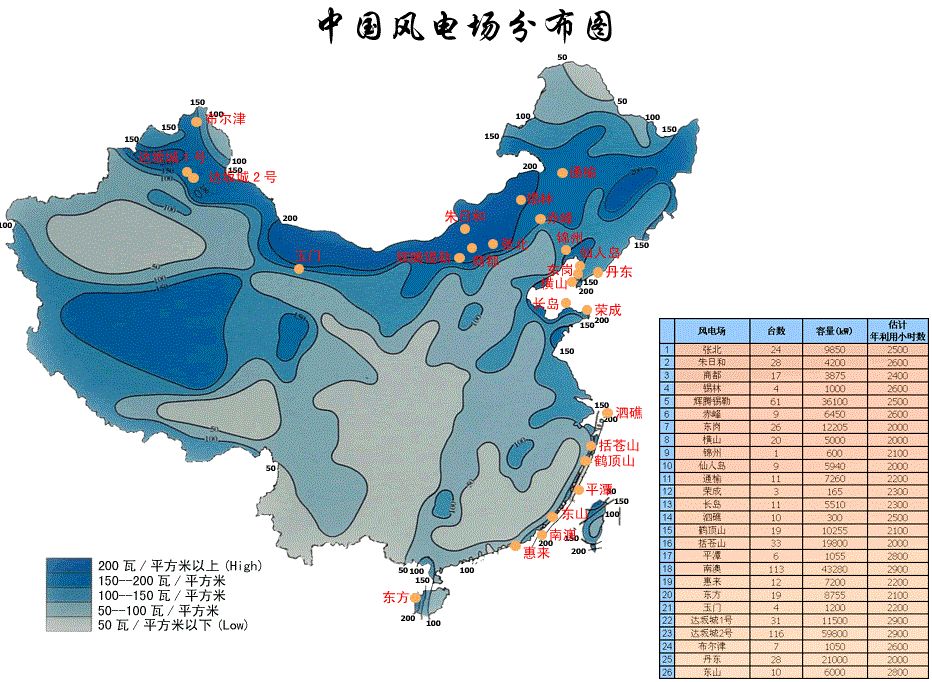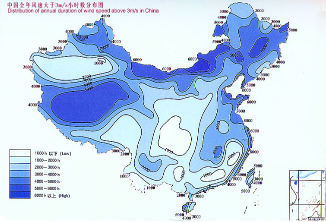 有效风能密度大于或等于200W/m2的等值线平行于海岸线;沿海岛屿有效风能密度在300W/m2以上,全年中风速大于或等于3m/s的时数约为7000~8000h,大于或等于6m/s的时数为4000h。