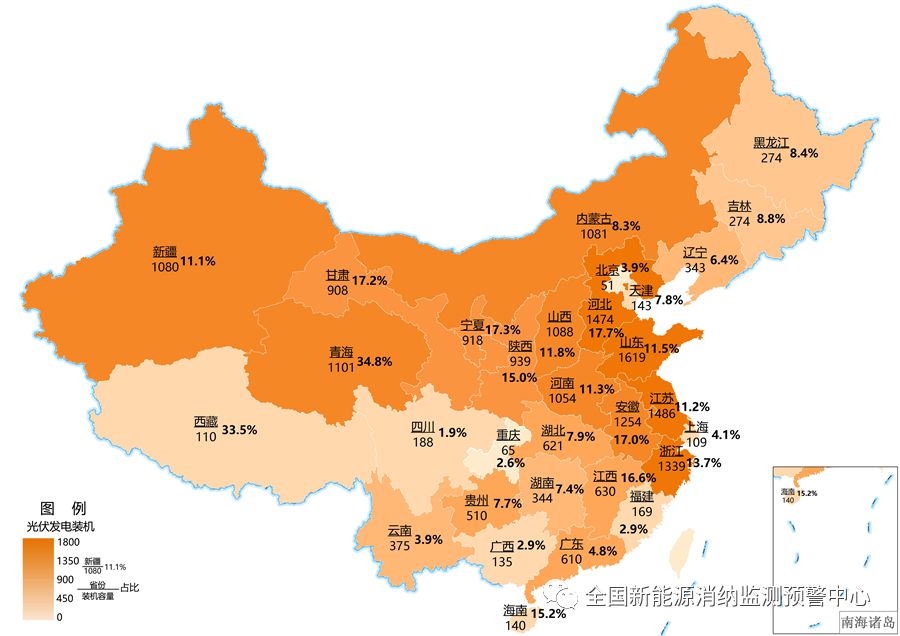 截至2019年12月底各地区累计光伏发电装机(万千瓦)及占本地区总装机比重