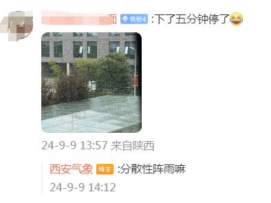 据西安气象消息,9月9日午后到夜间,西安市大部有小到中阵雨或雷阵雨天气,偏南偏东区县局地大雨,降水期间伴有短时强降水、雷电和短时大风(5-6级)等强对流天气,请相关区县做好防范。