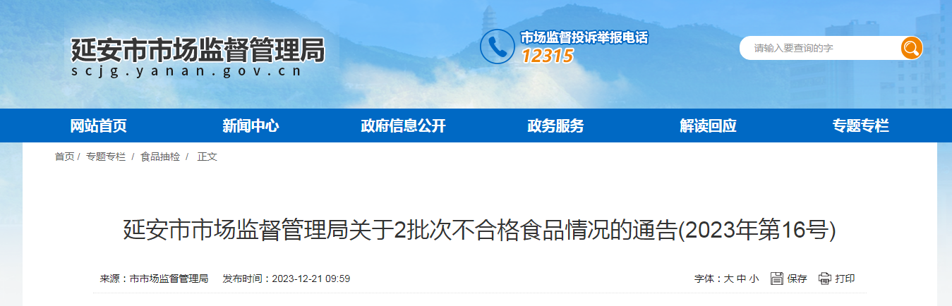 陕西省​延安市市场监督管理局关于2批次不合格食品情况的通告(2023年第16号)